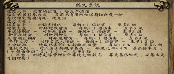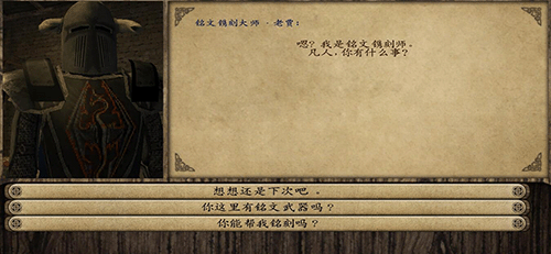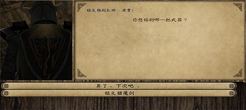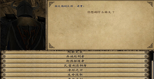 描述:和指定NPC对话,有铭刻的选项,点击可选择需要铭刻的武器,再次点击出来一列可供选择的铭文,刻上铭文后,武器的面板下面会出现对应的铭文描述。